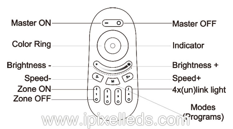 要一次调暗所有 RGBW 灯或更改颜色,请先按“Master ON”。要对单个灯执行此操作,请先按“Zone ON”。其次,根据色环或亮度环选择颜色或亮度。